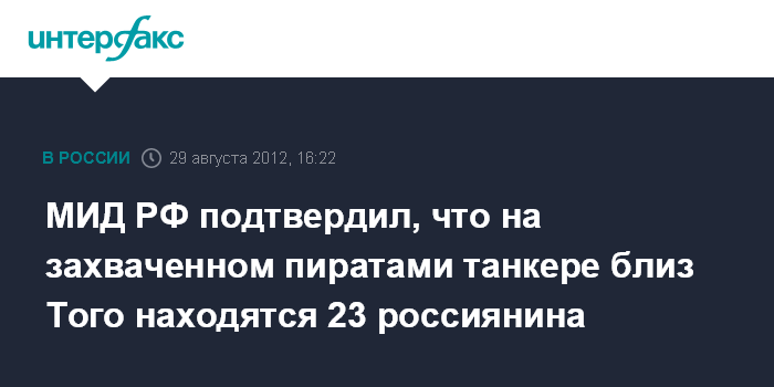 Москва. 29 августа. INTERFAX.RU - 23 россиянина, находящиеся на борту нефтяного танкера под британским флагом, были захвачены накануне пиратами в территориальных водах Африканской Республики Того.