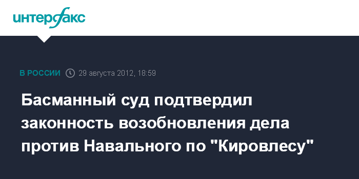 Москва. 29 августа. INTERFAX.RU - Басманный суд Москвы в среду признал законным возобновление уголовного дела по "Кировлесу" в отношении оппозиционера Алексея Навального.