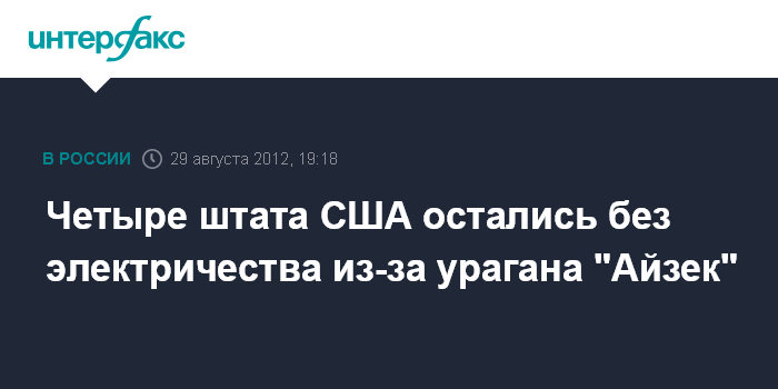Вашингтон. 29 августа. INTERFAX.RU - Более 550 тыс. человек остались без электричества в американских штатах Луизиана, Миссисипи, Флориде и Алабаме из-за урагана "Айзек", сообщает американский телеканал CNN.