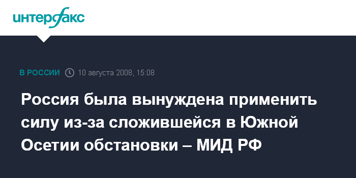 Москва. 10 августа. INTERFAX.RU - МИД РФ заявляет, что силового вмешательства России потребовала та обстановка, которая сложилась в зоне грузино-осетинского конфликта после 7 августа.