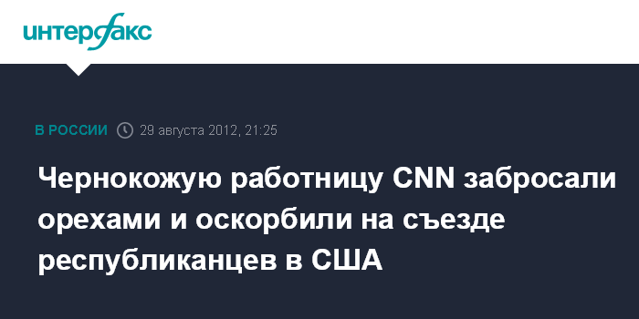 Вашингтон. 29 августа. INTERFAX.RU - Два человека забросали орехами и оскорбили афроамериканку - телевизионного оператора телеканала CNN - на съезде Республиканской партии США в городе Тампе, сообщается в заявлении организаторов съезда, распространенном в среду.