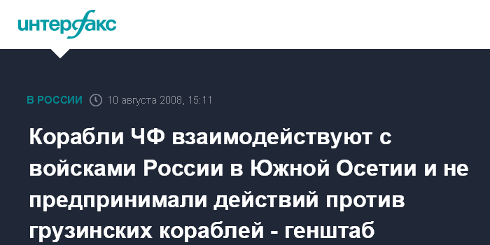Москва. 10 августа. INTERFAX.RU - Корабли Черноморского флота РФ осуществляют взаимодействие с войсками, выполняющими задачи в Южной Осетии, заявил в воскресенье журналистам в Москве заместитель начальника российского Геншатаба генерал-полковник Анатолий Ноговицын.