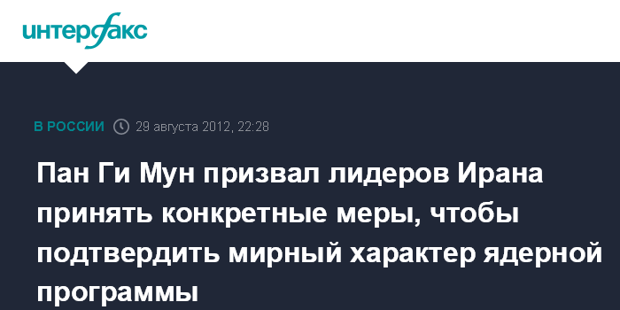 Нью-Йорк (ООН). 30 августа. INTERFAX.RU - Генеральный секретарь ООН Пан Ги Мун призвал президента Ирана Махмуда Ахмадинежада и руководителя Исламской республики аятоллу Али Хаменеи предпринять конкретные шаги, чтобы доказать мирный характер национальной ядерной программы, сообщил журналистам пресс-секретарь генсека Мартин Несирки. "Он (Пан Ги Мун - ИФ) сказал, что Ирану нужно предпринять конкретные шаги, чтобы развеять опасения Международного агентства по атомной энергии и доказать миру, что его ядерная программа преследует мирные цели", - сказал он.
