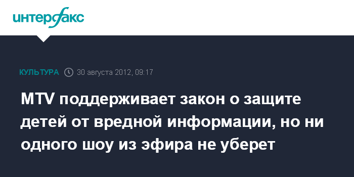Москва. 30 августа. INTERFAX.RU - Телеканал MTV не станет отказываться от своих программ после вступления в силу закона о защите детей от вредной информации.