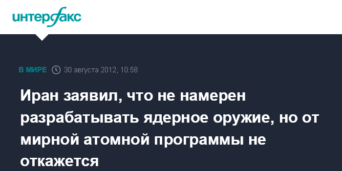 Тегеран. 30 августа. INTERFAX.RU - Лидер Ирана аятолла Али Хаменеи заявил в пятницу, что его страна никогда не будет разрабатывать ядерное оружие, сообщает местное государственное телевидение.