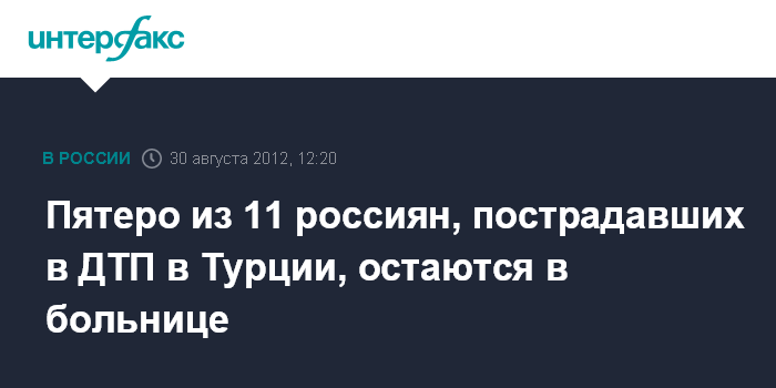 Москва. 30 августа. INTERFAX.RU - Пятеро из 11 российских туристов, пострадавших в среду в ДТП на турецком курорте Анталия, пока находятся в больнице Серика, их состояние - удовлетворительное, сообщили порталу "Интерфакс" в туркомпании "Анекс Тур", чьими клиентами являются пострадавшие.