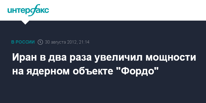 Вена. 30 августа. INTERFAX.RU - Власти Ирана в два раза увеличили количество центрифуг для обогащения урана на подземном ядерном объекте "Фордо", говорится в ежеквартальном докладе Международного агентства по атомной энергии (МАГАТЭ), распространенном в четверг. Число центрифуг для обогащения урана в "Фордо" возросло до 2,140 тыс. В мае их количество составляло 1064.