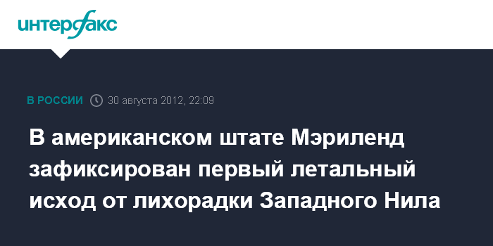 Вашингтон. 30 августа. INTERFAX.RU - Американские врачи зафиксировали первый случай смерти от лихорадки Западного Нила в штате Мэриленд на востоке США, сообщили в четверг журналистам представители местной службы здравоохранения. По словам медиков, скончавшийся - взрослый человек. Они пока не назвали его возраст, пол и место проживания.