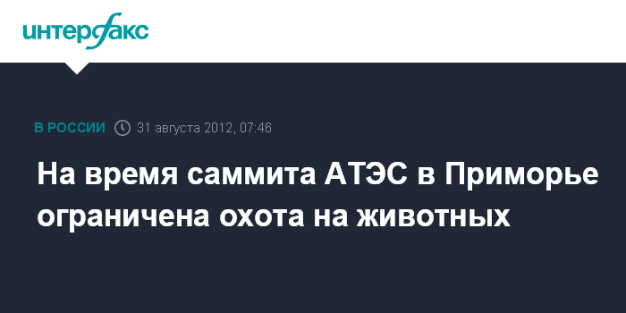 Владивосток. 31 августа. ИНТЕРФАКС - ДАЛЬНИЙ ВОСТОК - С 1 по 10 сентября, в период проведения саммита АТЭС во Владивостоке, на территории Надеждинского района и Артемовского городского округа запрещена охота, сообщает пресс-служба администрации Приморья.