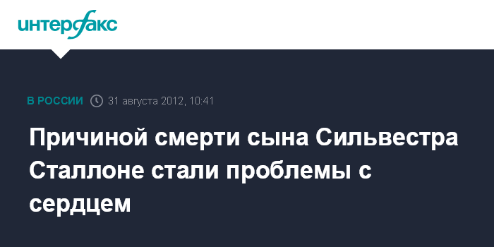 Вашингтон. 31 августа. INTERFAX.RU - Причиной смерти старшего сына голливудского актера Сильвестра Сталлоне Сэйджа стала ишемическая болезнь сердца, сообщили местным журналистам судебные следователи округа Лос-Анджелес.