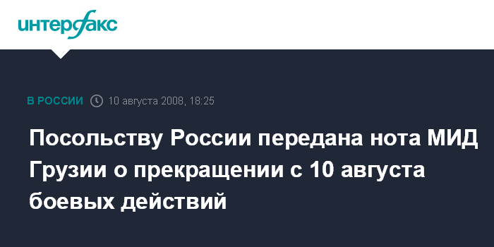 Тбилиси. 10 августа. INTERFAX.RU- МИД Грузии в воскресенье вручил консулу Российской Федерации в Грузии Смаге ноту, в которой говорится, что согласно распоряжению президента Грузии от 10 августа, вооруженные силы прекращают огонь в Южной Осетии, сказано в сообщении МИД Грузии, распространенном в воскресенье.