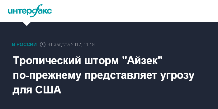 Вашингтон. 31 августа. INTERFAX.RU - Тропический шторм "Айзек" по-прежнему представляет серьезную угрозу, так как может вызвать паводковые наводнении и торнадо в штатах Луизиана и Миссисипи, сообщает в пятницу Национальный центр по наблюдению за ураганами США.