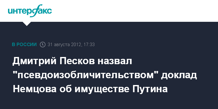 Ново-Огарево. 31 августа. INTERFAX.RU - Пресс-секретарь президента РФ Дмитрий Песков назвал псевдоизобличительством опубликованный недавно доклад оппозиции об имуществе главы государства.