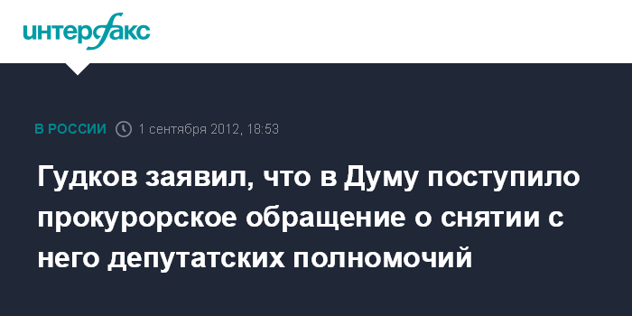 Москва. 1 сентября. INTERFAX.RU - В Госдуму поступило официальное обращение генерального прокурора Юрия Чайки, в котором он просит рассмотреть вопрос о досрочном прекращении депутатских полномочий члена фракции "Справедливая Россия" Геннадия Гудкова. "Вечером в минувшую пятницу в мою депутатскую приемную доставили копию письма генерального прокурора, адресованного спикеру Госдумы Сергею Нарышкину, озаглавленного - "О нарушениях депутатом Г.Гудковым условий осуществления своих полномочий, а также этических норм", - сообщил "Интерфаксу Г.Гудков.