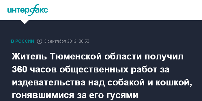 Житель Тюменской области получил 360 часов общественных работ за издевательства над собакой и кошкой, гонявшимися за его гусями