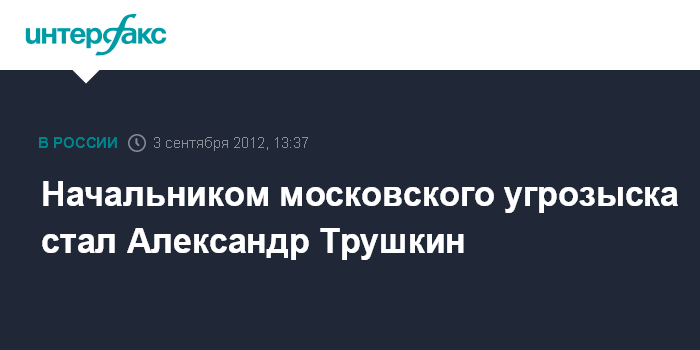 Москва. 3 сентября. INTERFAX.RU - Президент РФ Владимир Путин назначил Александра Трушкина начальником уголовного розыска главного управления МВД РФ по Москве.