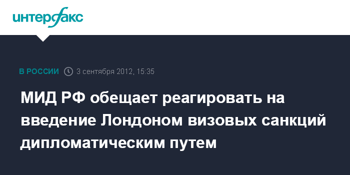 Москва. 3 сентября. INTERFAX.RU - Москва отреагирует на введение Лондоном визовых санкций в отношении россиян так, как это принято в мировой практике, заявил официальный представитель МИД РФ Александр Лукашевич.