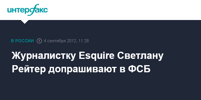 Москва. 4 сентября. INTERFAX.RU - В правозащитной организации "Агора" утверждают, что во вторник в ФСБ проходит опрос корреспондента журнала Esquire Светланы Рейтер в связи с публикацией ее материала "Кавказские борзые".