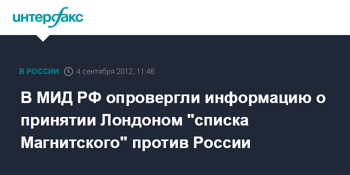 Москва. 4 сентября. INTERFAX.RU - МИД Великобритании опроверг в контактах с российской стороной информацию о принятии так называемого "списка Магнитского".