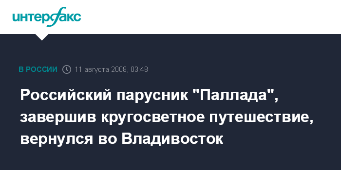 Москва. 11 августа. INTERFAX.RU - Учебное парусное судно "Паллада" Дальневосточного государственного технического рыбохозяйственного университета (Дальрыбвтуз) вернулось во Владивосток, завершив кругосветное путешествие, начатое в ноябре прошлого года.