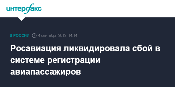Москва. 4 сентября. INTERFAX.RU - Сбой в системе бронирования "Сирена-Трэвел" и системах автоматической регистрации пассажиров, ликвидирован.