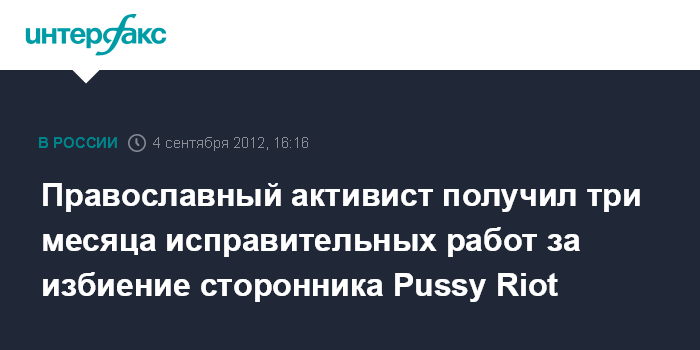 Москва. 4 сентября. INTERFAX.RU - Мировой участок Таганского суда Москвы приговорил к трем месяцам исправительных работ "православного активиста" Александра Орлова, избившего 19 апреля у суда сторонника панк-группы Pussy Riot.
