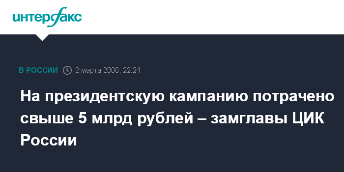 Москва. 2 марта. INTERFAX.RU - На проведение выборов президента РФ было потрачено 5 млрд 125 млн рублей, сообщил замглавы ЦИК Сергей Вавилов.