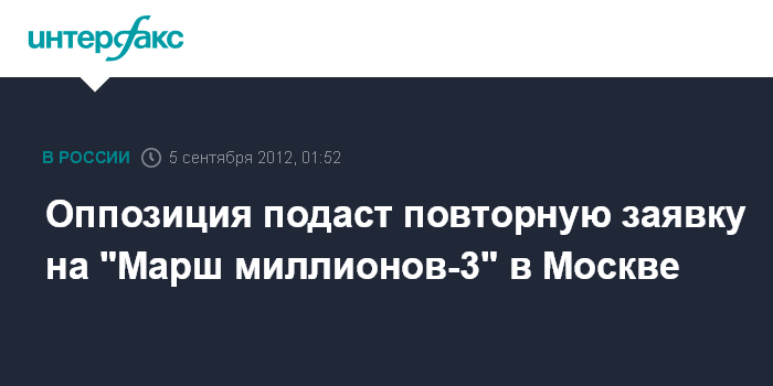 Москва. 5 сентября. ИНТЕРФАКС - Активисты оппозиции, как ожидается, в среду утром подадут повторную заявку в мэрию Москвы на проведение 15 сентября "Марша миллионов" - шествия от Белорусского вокзала по Тверской до Боровицких ворот, где намечено провести митинг.