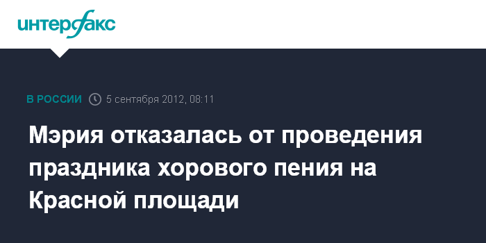 Москва. 5 сентября. INTERFAX.RU - Мэр столицы Сергей Собянин признал утратившим силу распоряжение правительства города "О проведении праздника хорового пения на Красной площади 15 сентября 2012 года", сообщил в среду "Интерфаксу" источник в городской администрации.