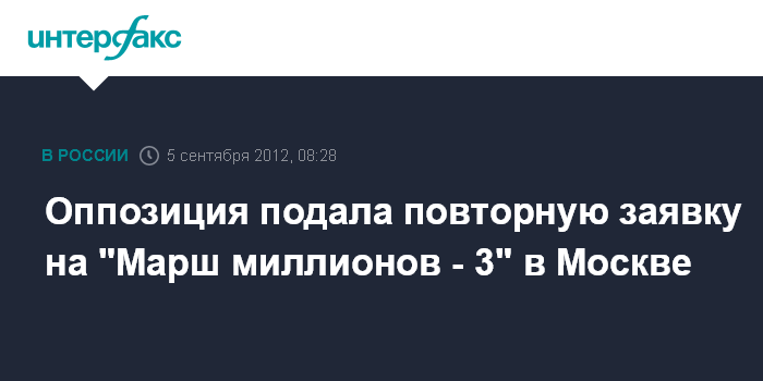 Москва. 5 сентября. INTERFAX.RU - Оппозиция в среду утром повторно подала в мэрию заявку на проведение 15 сентября в Москве "Марша миллионов - 3" - шествия от Белорусского вокзала по Тверской и митинга.