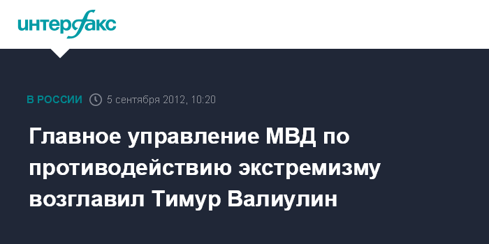 Москва. 5 сентября. INTERFAX.RU - Начальником Главного управления МВД РФ по противодействию экстремизму назначен полковник полиции Тимур Валиулин.