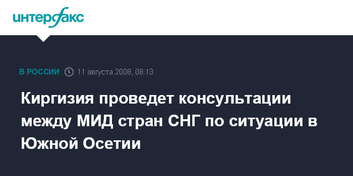"Руководствуясь статьей 18 устава СНГ и, принимая во внимание председательство Киргизии в СНГ, К.Бакиев поручил министерству иностранных дел республики в кратчайшие сроки провести консультации с внешнеполитическими ведомствами государств-участниц СНГ по ситуации в Южной Осетии", - говорится в сообщении пресс-службы главы Киргизии, распространенном в понедельник.