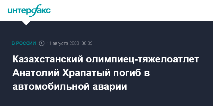 Москва. 11 августа. INTERFAX.RU - Известный советский и казахстанский спортсмен - многократный чемпион мира и олимпийский чемпион по тяжелой атлетике Анатолий Храпатый погиб в дорожно-транспортном происшествии близ Астаны на территории Акмолинской области республики.