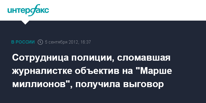 Москва. 5 сентября. INTERFAX.RU - Сотрудница полиции, которая после майского "Марша миллионов" 6 мая в Москве сломала фотоаппарат журналистке, привлечена к дисциплинарной ответственности, сообщил официальный представитель правозащитной ассоциации "Агора" Дмитрий Колбасин.