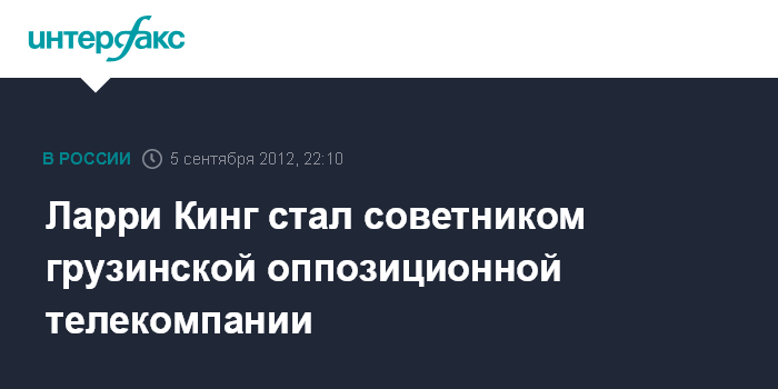 Тбилиси. 5 сентября. INTERFAX.RU - Всемирно известный телеведущий Ларри Кинг стал советником грузинской телекомпании "9-й канал", которая принадлежит оппозиционному миллиардеру Бидзине Иванишивили.