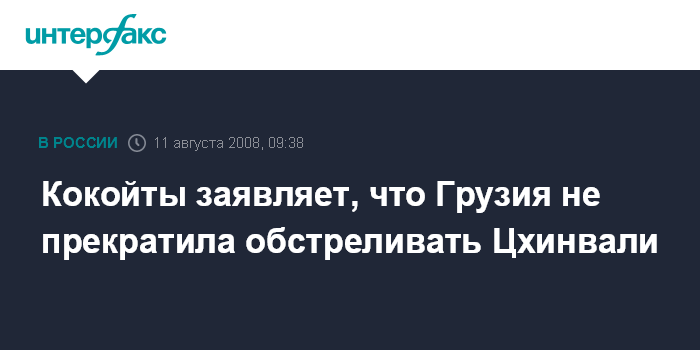 Москва. 11 августа. INTERFAX.RU - Президент Южной Осетии Эдуард Кокойты заявляет, что грузинская сторона не придерживается объявленного прекращения огня. "Говоря о ситуации, о тех шагах, которое сегодня якобы предпринимает грузинское руководство, то есть заявление о перемирии и так далее, я хочу сказать, что ни одному слову со стороны Грузии я не верю", - сказал в понедельник Кокойты в эфире телеканала "Вести-24".