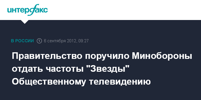 "Министр связи и массовых коммуникаций Николай Никифоров направил министру обороны Анатолию Сердюкову письмо, где указал, что правительство поручило обеспечить передачу частот, которые использует для эфирного вещания телеканал "Звезда", Общественному телевидению (ОТ)", - сообщает издание, ссылаясь на собственную информацию.