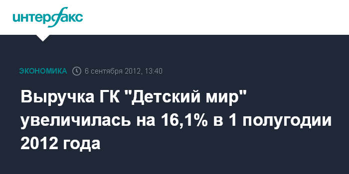 Москва. 6 сентября. INTERFAX.RU - Выручка ГК "Детский мир" за первые 6 месяцев 2012 года увеличилась на 16,1% до 10,65 млрд. руб. по сравнению с 1 полугодием 2011 года, говорится в сообщении ритейлера.