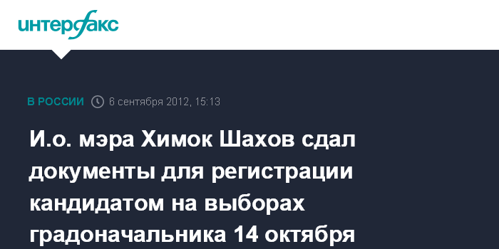 Москва. 6 сентября. INTERFAX.RU - Исполняющий обязанности мэра подмосковных Химок Олег Шахов выдвинул свою кандидатуру на выборы мэра города, сообщила заместитель председателя Мособлизбиркома Наталья Земскова. "Олег Шахов сдал сегодня документы для регистрации кандидатуры на пост мэра Химок", - сказала Земскова "Интерфаксу" в четверг.
