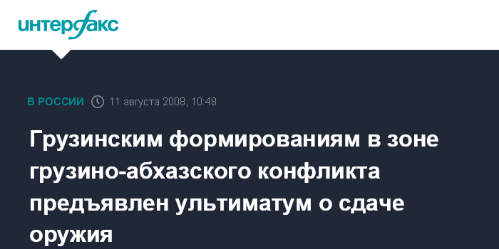 Гали. 11 августа. INTERFAX.RU - Российские миротворцы в зоне грузино-абхазского конфликта предъявили грузинским вооруженным формированиям ультиматум о сложении оружия, сообщил "Интерфаксу" командующий миротворческими и силами генерал-майор Сергей Чабан.