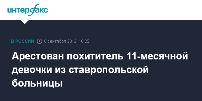 4 сентября в больницу им. Г.К. Филипского пришел человек кавказской национальности, представился дедушкой ребенка и забрал его из больницы. В тот же день мужчина был задержан с ребенком около парка Победы Ставрополя. Похититель сообщил, что хотел увезти девочку в Ереван и самостоятельно заниматься ее воспитанием.
