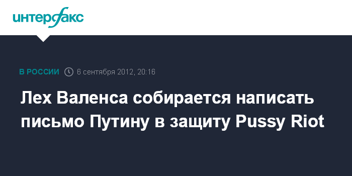 Варшава. 6 сентября. INTERFAX.RU - Известный польский политик и защитник прав человека Лех Валенса отправит президенту РФ Владимиру Путину письмо, в котором выразит протест против заключения в тюрьму участниц группы Pussy Riot, сообщает в четверг польское радио.