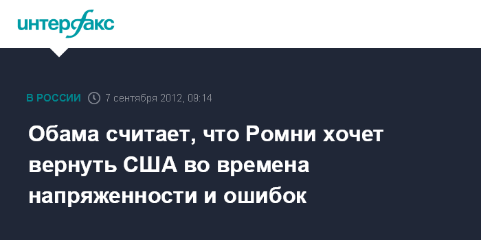 Вашингтон. 7 сентября. INTERFAX.RU - Президент США Барак Обама, который выдвинут демократической партией США в качестве кандидата на новый президентский срок, подверг критике внешнеполитические установки своего противника от республиканской партии Митта Ромни.