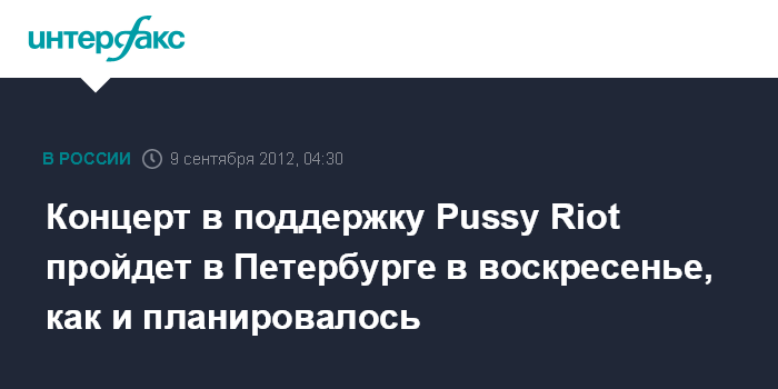 Санкт-Петербург. 9 сентября. ИНТЕРФАКС СЕВЕРО-ЗАПАД - Концерт в поддержку осужденных участниц панк-группы Pussy Riot пройдет в Петербурге в воскресенье, 9 сентября.