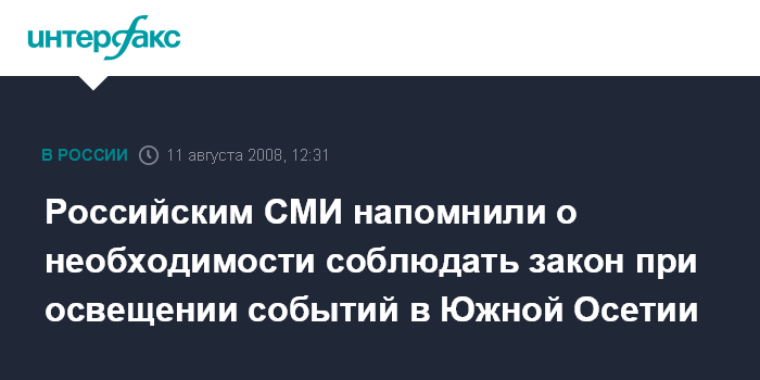 В связи с событиями в Южной Осетии Россвязькомнадзор обращает внимание редакций на необходимость неукоснительного соблюдения ст. 4 закона РФ о СМИ в части недопущения использования СМИ "для распространения экстремистских материалов, в которых, в частности, могут содержаться признаки возбуждения социальной, расовой, национальной или религиозной розни, пропаганды исключительности, превосходства или неполноценности человека по признаку его социальной, расовой, национальной, религиозной или языковой принадлежности или отношения к религии".