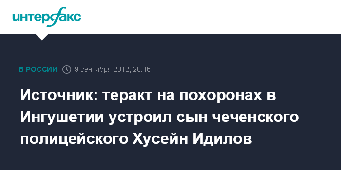 Назрань. 9 сентября. INTERFAX.RU - Смертником, совершившим теракт на похоронах полицейского в Малгобекском районе Ингушетии, являлся 29-летний сын бывшего начальника одного из РОВД Чечни Хусейн Идилов, сообщил агентству "Интерфакс-Юг" источник, близкий к следствию.