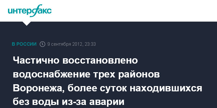 Воронеж. 9 сентября. ИНТЕРФАКС - Три района Воронежа сутки находились без водоснабжения в результате аварии на окраине города.