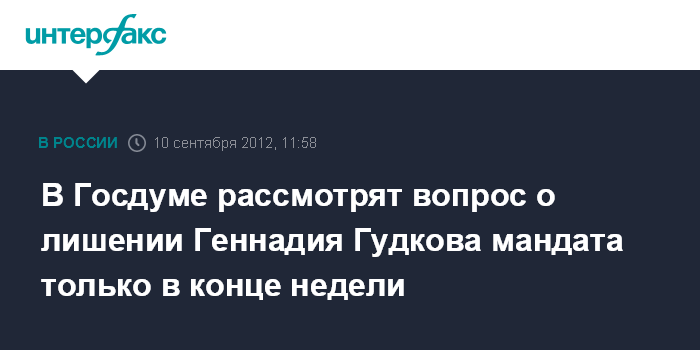 Москва. 10 сентября. ИНТЕРФАКС - Вопрос о лишении мандата депутата-справоросса Геннадия Гудкова, подозреваемого в ведении предпринимательской деятельности, может быть рассмотрен только после заседания профильной комиссии, а значит ни во вторник, ни в среду, заявил руководитель фракции "Единая Россия" в нижней палате Андрей Воробьев.