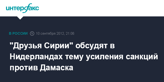 Амстердам. 10 сентября. INTERFAX.RU - Группа "Друзей Сирии" 20 сентября проведет встречу в Голландии, где будет обсуждаться вопрос о введении новых санкций против сирийского режима, сообщил в понедельник МИД Нидерландов.
