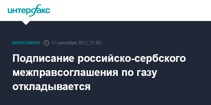 Москва. 11 сентября. INTERFAX.RU - Подписание российско-сербского межправительственного соглашения о сотрудничестве в газовой сфере откладывается из-за новых требований сербской стороны, сообщил Агентству газовой информации (АГИ) источник, близкий к переговорам.